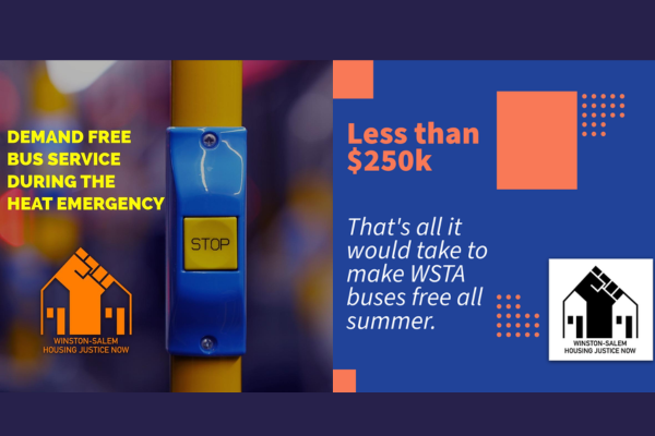 HJN’s demands of city government were organized from a rapid response team started in June in response to record-breaking temperatures and dangerous conditions during which Winston-Salem tenants and pedestrians were forced to give up bus fare in exchange for relief from oppressive heat. Next, tenants set up a petition drive, providing direct aid to bus riders and explaining why they were demanding free bus service during climate extremes. HJN also partnered with Piedmont Environmental Alliance, Winston-Salem Democratic Socialists of America, and Twin City Harm Reduction Collective to spread the word and call for signatures, gathering about 1,000 signatories.